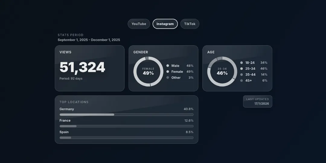 An easy way to understand your presence beyond Twitch aka reach and demographics across YouTube, Instagram and TikTok.